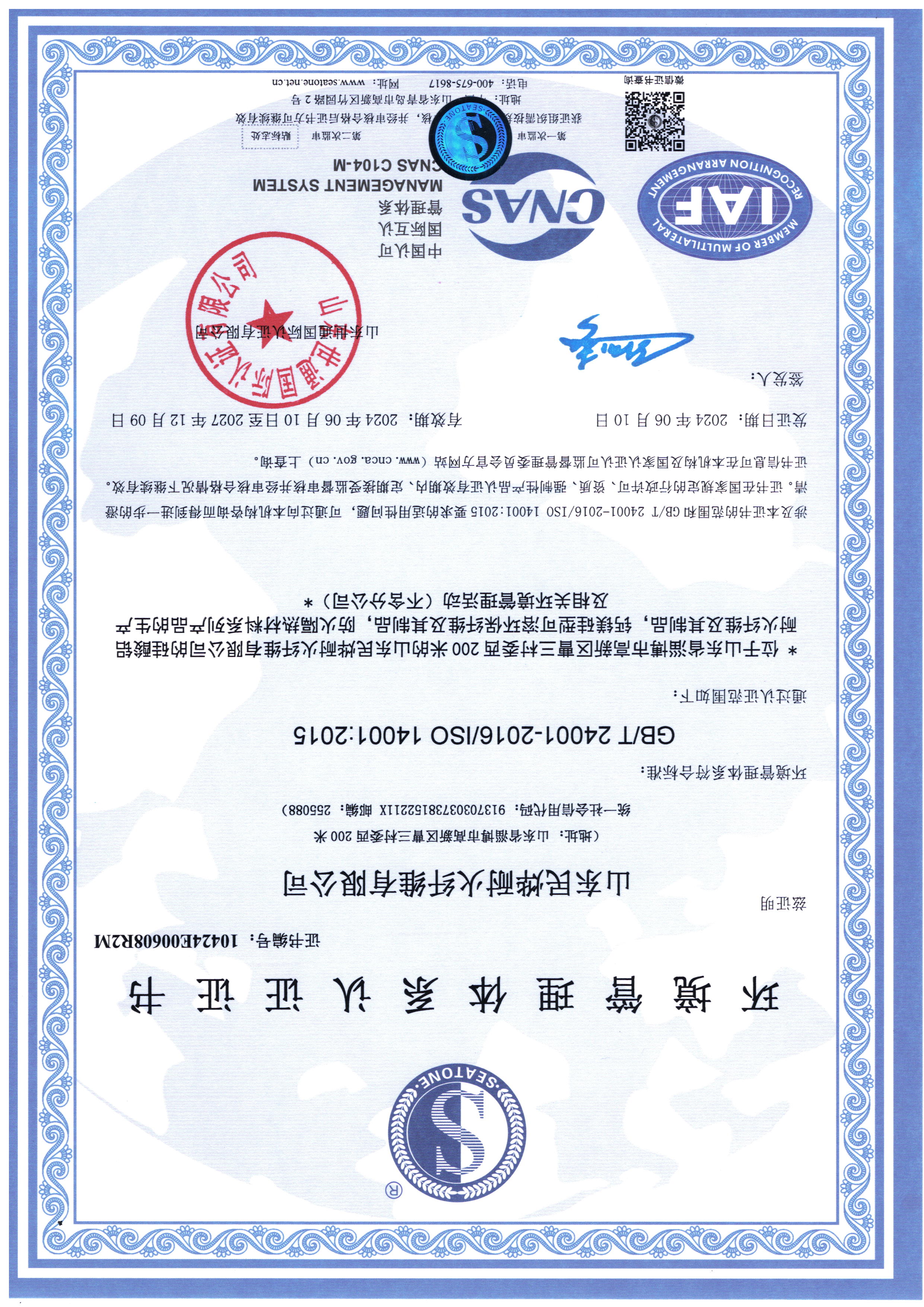 • 2024年環(huán)境體系認證證書